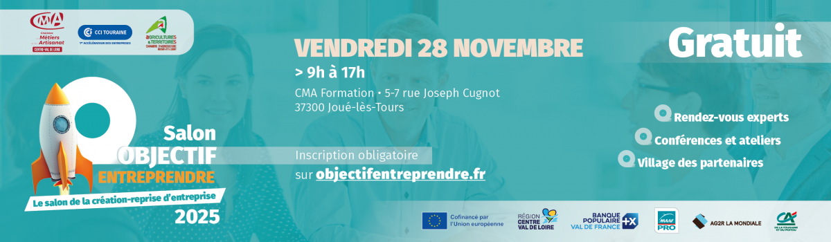 La Chambre de Métiers et de l'Artisanat Centre-Val de Loire, la Chambre de Commerce et d'Industrie Touraine et la Chambre d’Agriculture Indre-et-Loire organisent ce salon destiné à tous ceux qui ont un projet de création ou de reprise d'entreprise, aux personnes en reconversion, aux jeunes entrepreneurs et aux dirigeants d'entreprise.
